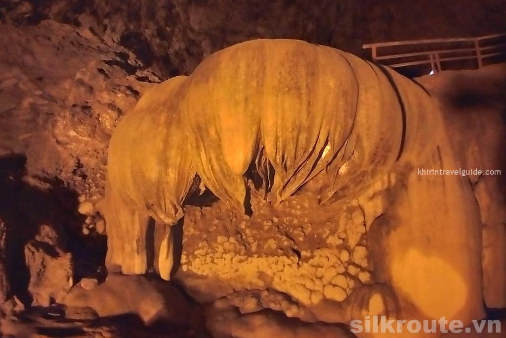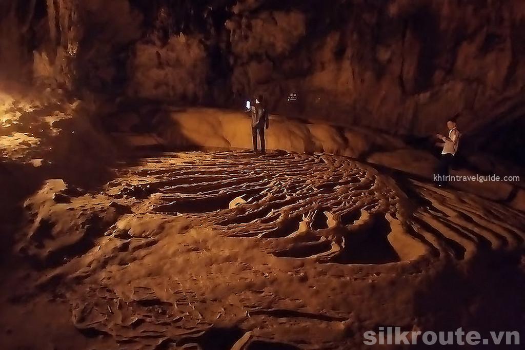 There are a few places where the passage is only Có một số đoạn thấp chừng 1m high, you need to bend to go through. There are other places where water is dripping, testifing for the on going proccess of stalactite formation, however, it may be slippery there. Be sure to carry a flashlight with you and don’t miss the this amazing place.
