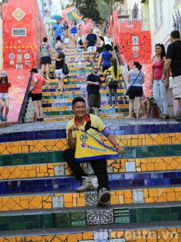 Thế nên từ rất nhiều năm trước khi dẫn đoàn đi nước ngoài mình đã né không cầm cờ tam giác khi đi tham quan, và chỉ cầm cờ công ty cho các bức ảnh chung cả đoàn. Thay vào đó mìmh cầm những thứ gì nó dễ thương tí xíu, có bản sắc địa phương và có màu sắc nổi tí xíu để khách dễ nhìn. Việc này thực ra là mình chỉ học hỏi người ta thôi chứ không mới mẻ gì, do cũng đi guide inbound từ lâu, có một lần mình thấy một anh tourleader Nhật Bản cầm cây cờ đoàn là một con cá koi bay bay, thật dễ thương và thật cá tính, mình nhớ mãi và bắt chước.