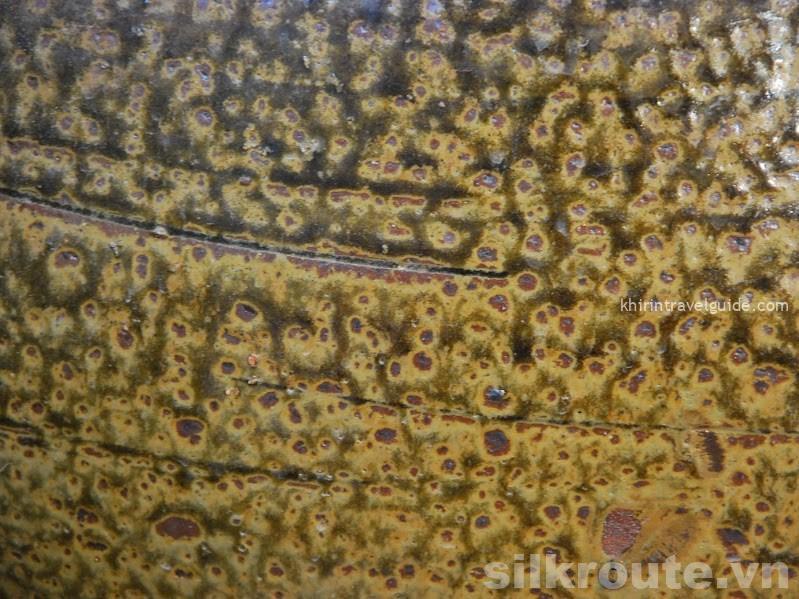 – Trước hết nhìn tổng thể món đồ thấy màu men chính vàng óng đẹp mắt, đâu đó gần với màu vàng trên lườn của con lươn, không phải màu đen trên lưng con lươn cũng không phải màu vàng bệch như dưới bụng con lươn.