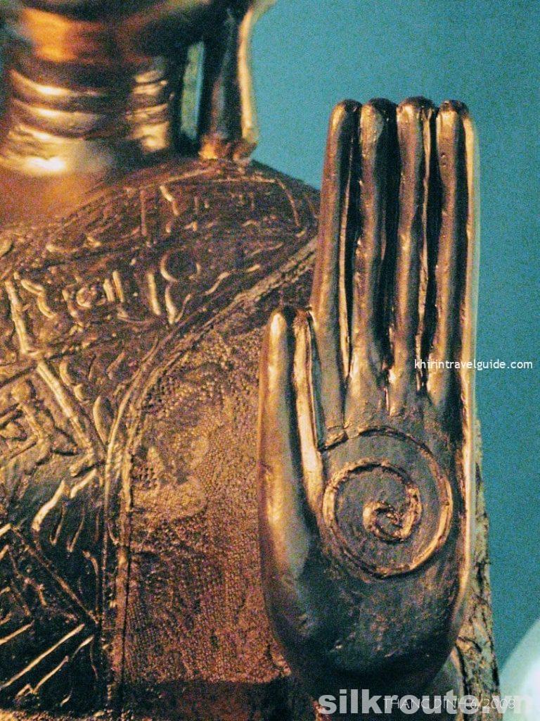 Ảnh: (1) Thủ ấn “vô úy” trên bức tượng đức Phật của một nghệ nhân Khmer trưng bày tại bảo tàng Văn hóa các dân tộc Việt Nam ở Thái Nguyên (6/2008). (2) Tượng phật trong chính điện chùa Sam Rông, Sóc Trăng (4/2020).